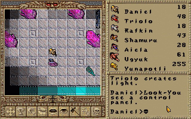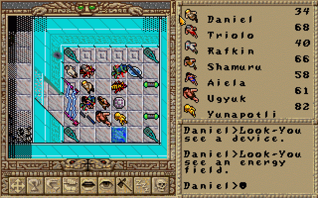This is the only written text in the game, and is hardcoded in GAME.EXE. It gives you a hint as to what you need to do. Place the metal head on the gold statue, who will join you automatically. The new party member, Yunapotli, is invulnerable in the Kotl city, so you can send him in solo mode on any dangerous mission. Get him to open the door, and then learn all you can from him and Katalkotl, the hologram to the north by the teleporters. Yunapotli will also tell you about Kotl devices once you give him his brain, but you can get him to talk about them even without it.