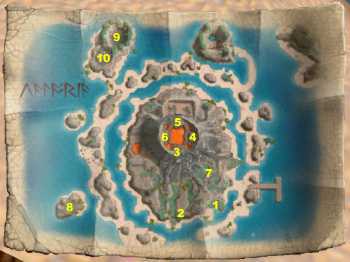 (1) (84º13"N, 46º44"W) Head from the dock to the inner shore of the island. Follow it south and find Reynald dying from mortal wounds sustained in combat with a demon. He gives you the Heirloom shield and begs you to give it to his brother. Check to make sure it's in your inventory!
